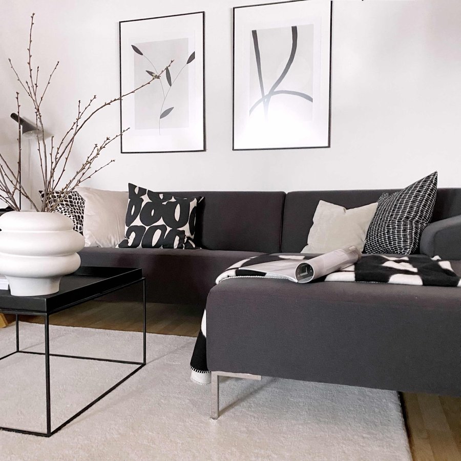 Couch, Sofa, Wohnzimmer, Livingroom, Living, Scandi, Skandinavisch, Vase, Plaid, Kissen, Bilder, Frühling, Zweige, Teppich, Nordic, hmhome, Hay Beistelltisch, Marimekko
