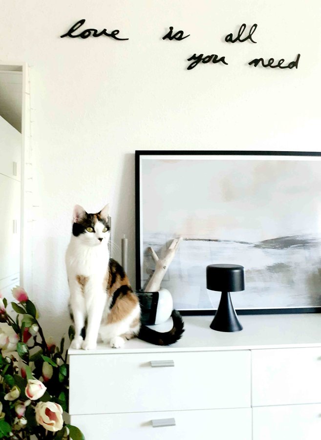 Bild, Lampe, Sideboard, Schriftzug, skandinavisch Wohnen, Black and white