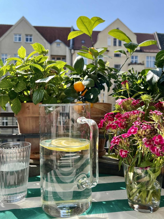 Balkon, Balkonpflanzen, Blumen, Glas, Glaskrug