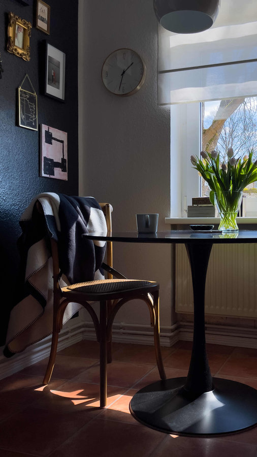 Küche, Sitzplatz, Runder Tisch, Kaffee, schwarze Wand, Küchenstuhl, Essplatz, Bollhagen Dose, Tulpen, Vase, Wanduhr, Galerie, Küchengalerie