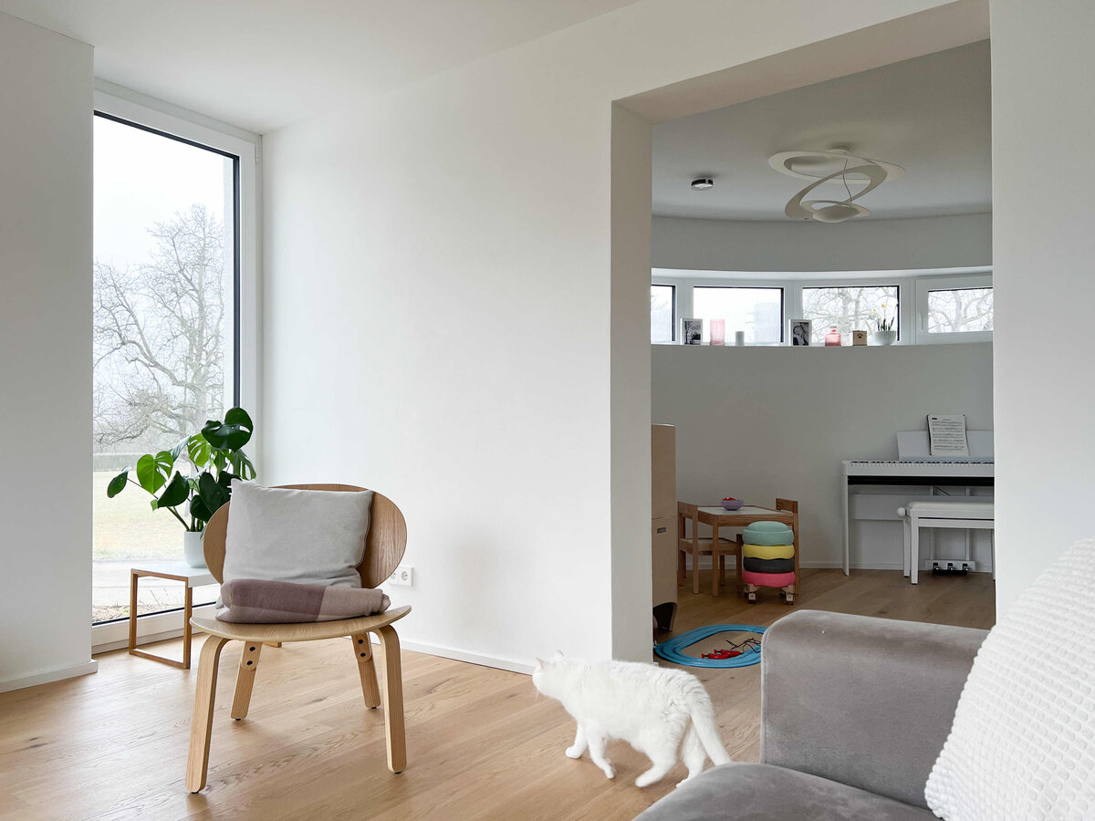 Ein Raum, der Spielzimmer, Bibliothek und Musikzimmer zugleich ist. Die runde Außenwand und das 6 m lange Fensterband bringen Licht in den Raum und eröffnen im Sommer den Blick auf die grünen Baumkronen. Kaum vorzustellen, dass dieser Raum ursprünglich mal ein Bad war.