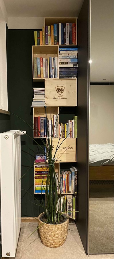 …. endlich haben auch meine Bücher Heimat gefunden. Lange, sehr sehr lange war ich auf der Suche nach einem geeigneten Regal, da der Platz in dieser Ecke begrenzt ist. Dabei war das Naheliegende wieder mal so nah!!! 😅 Zack, kamen ein paar Weinkisten an die Wand, ich habe sogar zwei mit Schiebedeckel bekommen, was das ganze noch abrundet. Auf die Plätze fertig, lesen ….. 🤩