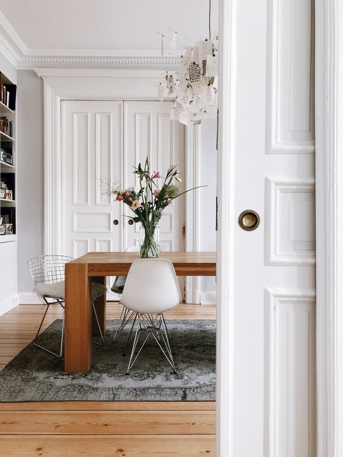Essbereich, Esszimmer, Altbau, Flügeltür, Teppich, Blumen