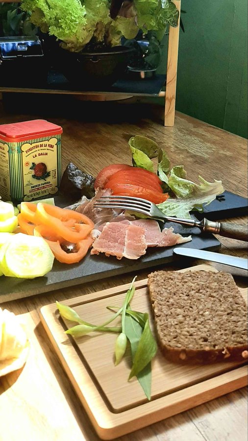 Mittagessen, Tapas Brett, Gemüse, Schinken, Salat, Schiefer, Bamvusbrettchen, Holztisch, Küche, Holzbesteck, Käse, Bärlauch, Brot, Glücklich, Shop