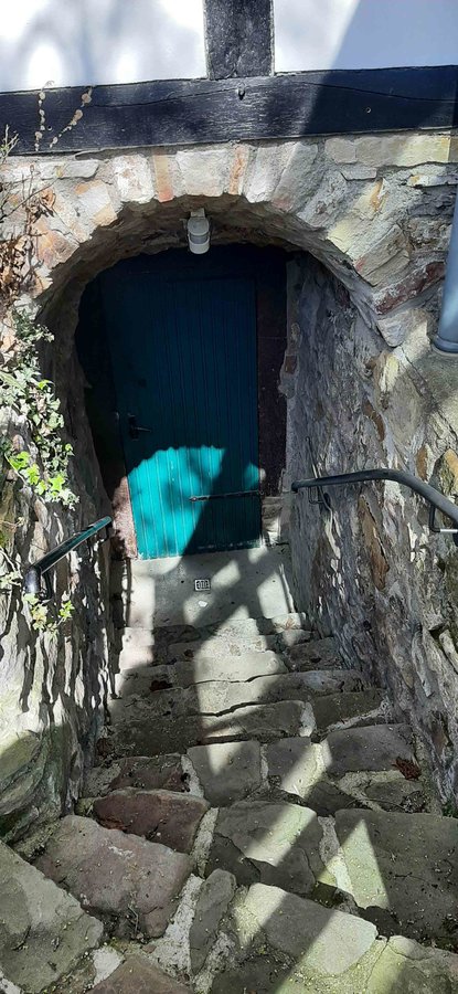 Steintreppe, Kellertreppe, Natursteine, Holztür, Grün, fachwerkhaus