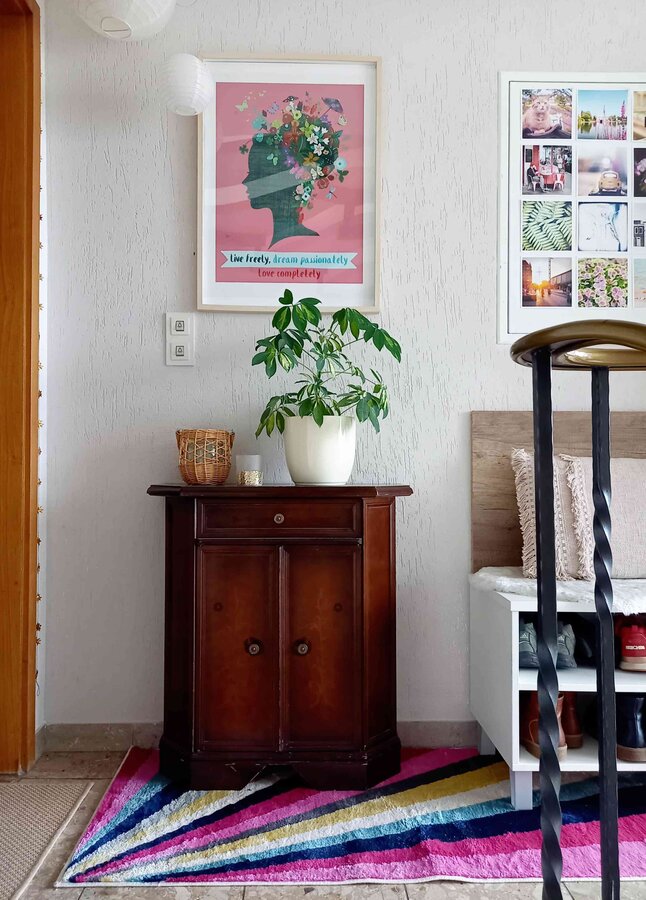 Mir ist gerade nach Farbe und als ich gestern diesen tollen Teppich sehr günstig gesehen habe wurde er mitgenommen. "Irgendwo wird er schon hinpassen" 😄. Es wurde dann der Eingangsbereich. Schönes Wochenende!