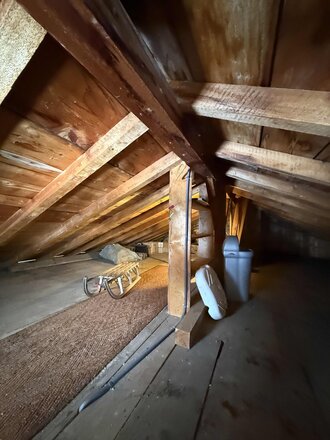 Das kleine Chalet hat durch die Galerie mehr Platz erhalten. Es wirkt nun deutlich grösser. Der Dachboden ist ein offener Raum mit dem original Holzboden, den wir einfach geschliffen haben. Der obere Bereich bietet Schlafmöglichkeiten, aber auch ein kleines Kämmerchen für Vorräte.