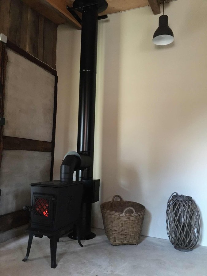 Tiny Scheune. Der neue Ofen mit Schornstein.