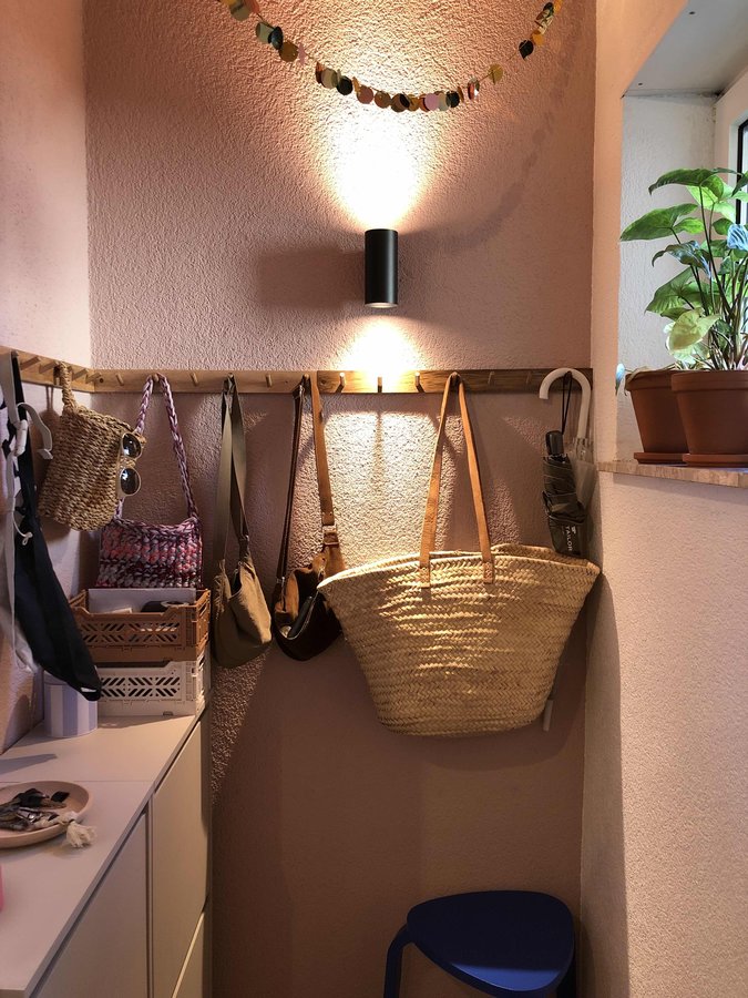 Flur, Garderobe, Makeover, Hakenleiste, Wandleuchte, Ikea, Wandfarbe Rosa, HAY