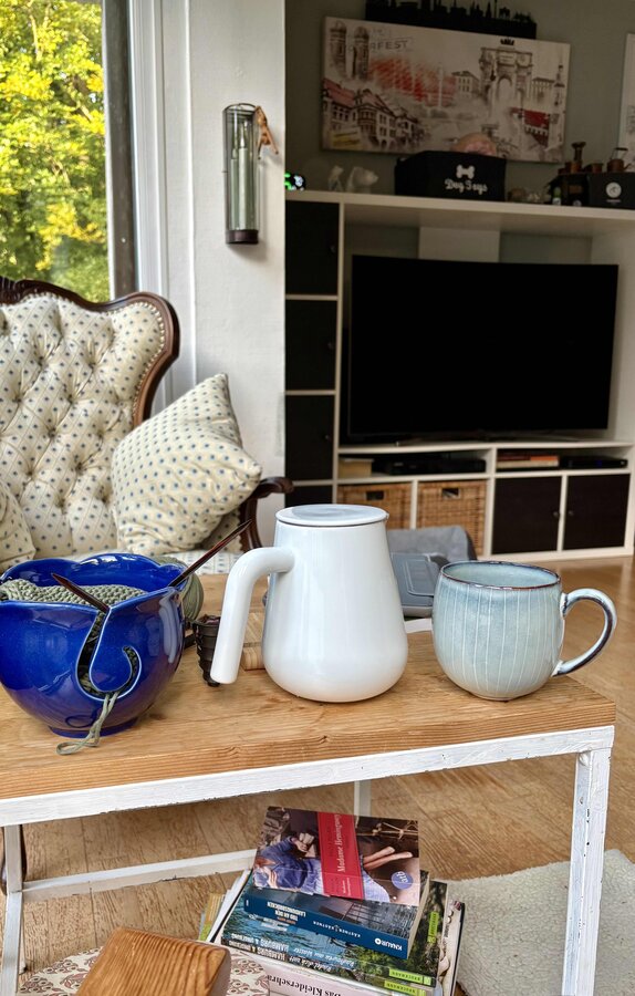 Kaffee, Strickzeug, Wohnzimmer, Erker, Sannestil