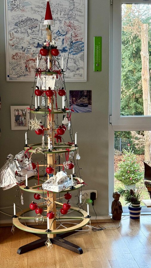 Der Baum im Garten steht so, dass alle Bewohner mit Fenster zum Garten ihn sehen können. Meine Nachbarin unten aus der Küche und vom Sofa und über uns vom Esstisch und ich auch vom Sofa. So haben alle was davon. Unser Schwedischer Jahresbaum passt farblich gut zu dem im Garten und ich genieße das sehr in dieser Jahreszeit.
