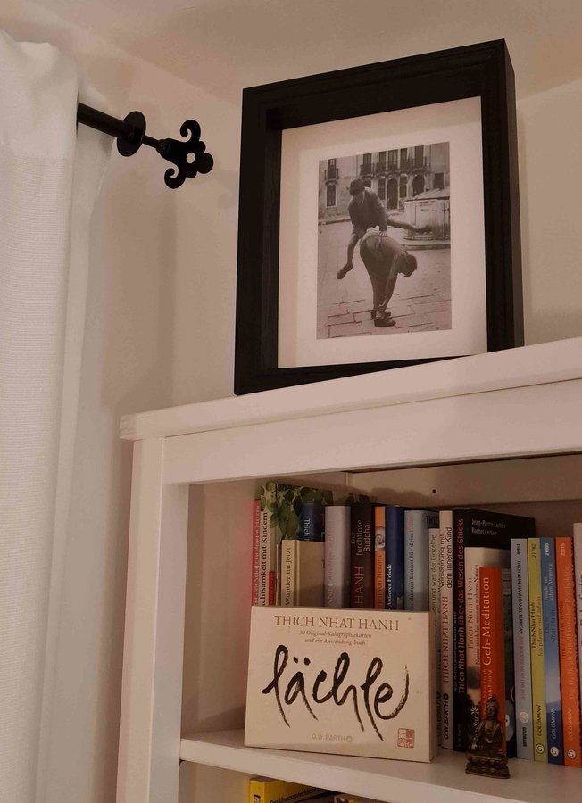 Auf meinem weißen Regal wollte ich unbedingt eine Schwarzweiss-Fotografie in einem schwarzen Rahmen - und wurde fündig. Mir gefällt diese alte Pausenhofszene aus Rom so gut und ich freu mich ständig daran!