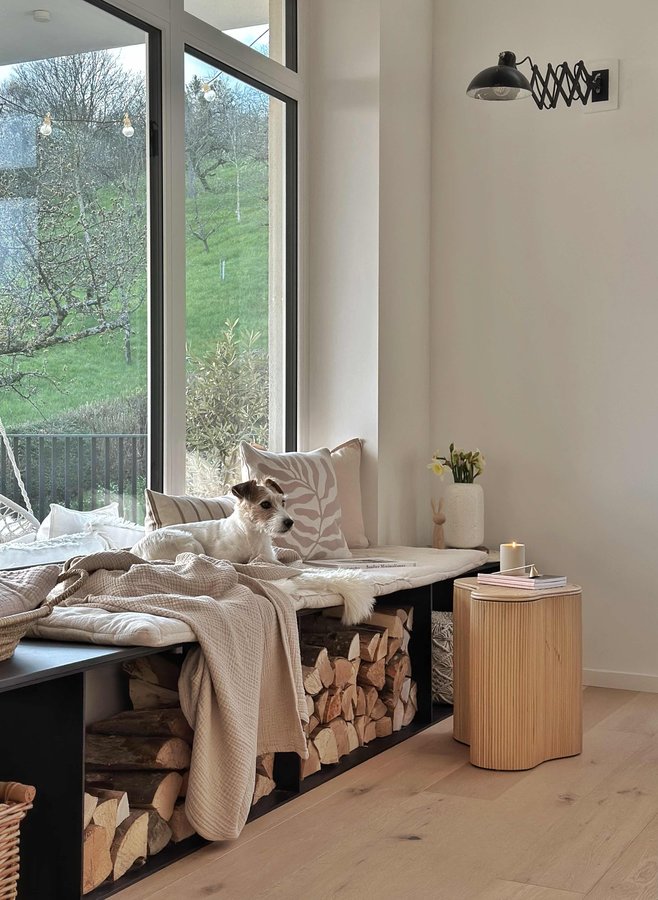 Der Terrier verbringt heute einen gemütlichen Feiertag auf der Kaminbank. 🐶