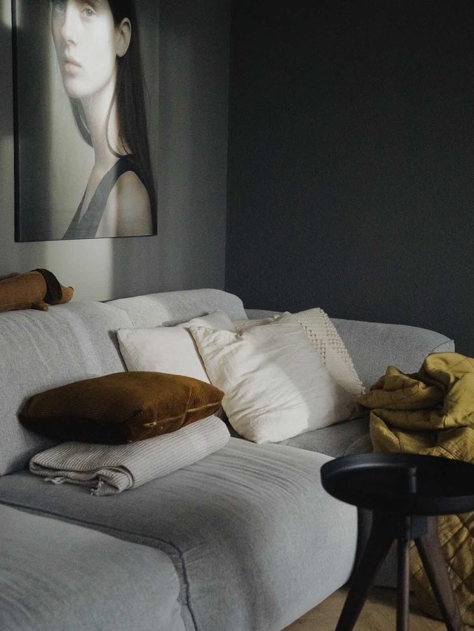 Damit es schön kuschelig wird, haben wir dunkle Farben für das neue Wohnzimmer gewählt. Das Abendlicht harmoniert perfekt.