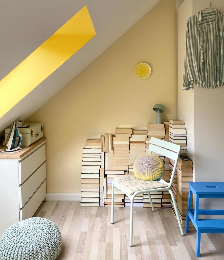Dachgeschoss, Gelb, Hauswirtschaftsraum, Gartenstuhl, Blau, Bücher