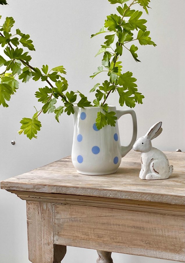 osterzeit, Hase, AlterHolztisch, Krug, Langenthaler, Porzellan, punkteliebe, Zweige, frühlingsgrün, Blau, Weiss, Holz, Deko