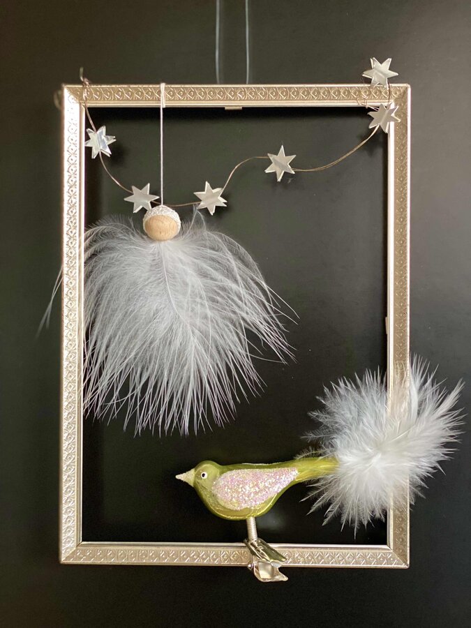 DIY, Upcycling, Silber Bilderrahmen, Alt, Engel im Federkleid, Vögelchen, Handbemalt, Baumschmuck, Brocante, Nostalgie, Winter, Advent Weihnachten Deko
