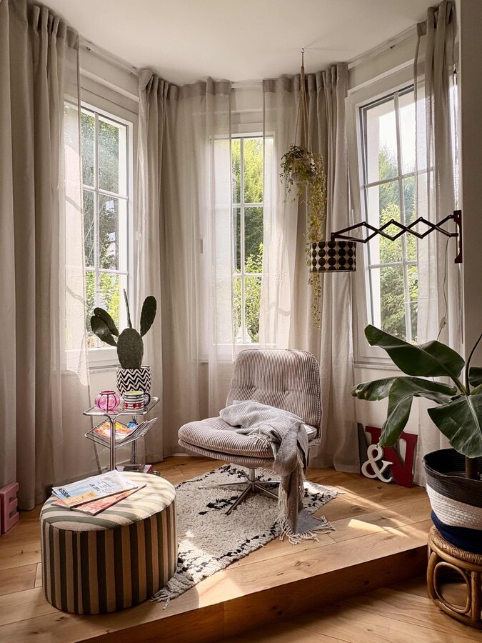 Sessel, Vintage, Scherenlampe, Kaktus, Bananenbaum, Hocker, Sostrene Grene, Berberteppich, HM Home, Beistelltisch, Fenster, Erker