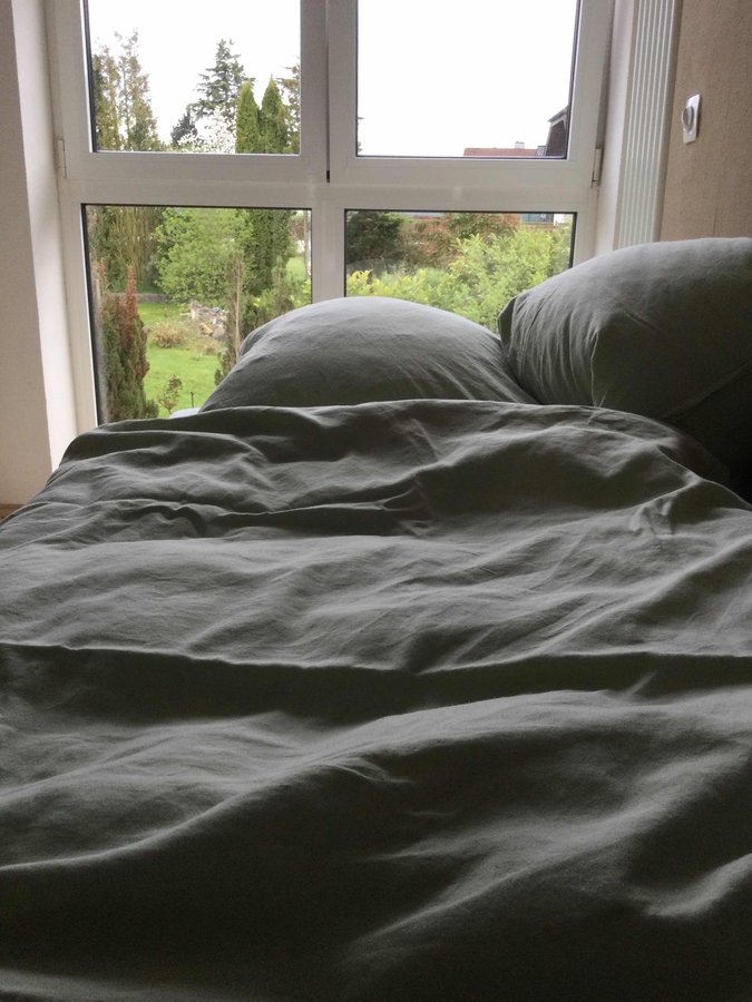 Da zur Zeit mein Schlafzimmer renoviert wird, habe ich mir ein Übergangsbett im Zimmer meines Mannes gebaut. Irgendwie finde ich, dass die grüne Bettwäsche gut zur grünen Natur vor dem Fenster passt