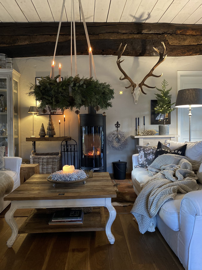 Adventskranz, fachwerkhaus, Weihnachtsdekoration, Geweih, gemütlichwohwohnen, Cottagestyle, Kaminofen, Landhausstil, Wohnzimmer, Bauernhaus, Weihnachtszeit