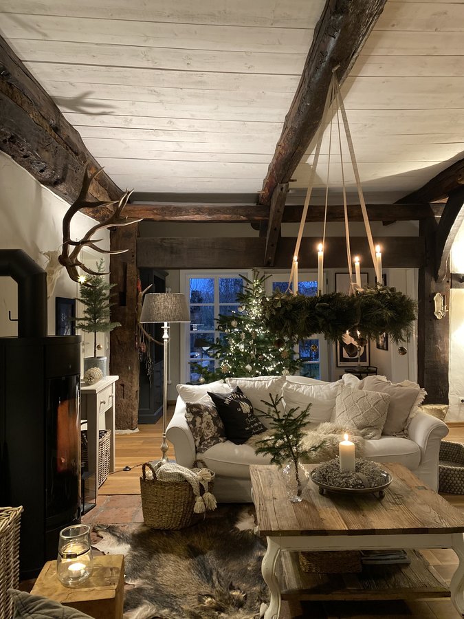 Adventskranz, Adventszeit, Kaminofen, Sofa, Couchtisch, fachwerkhaus, Bauernhaus, Gemütlichkeit, Wohnzimmer