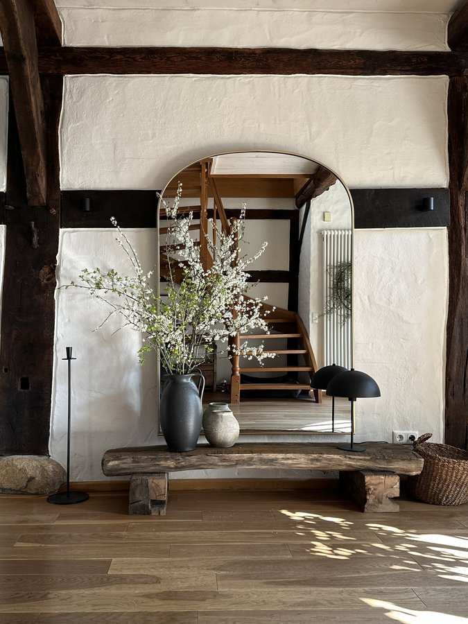 Wandspiegel, Holzbank, fachwerkhaus, cottageliving, cozycottage, Rustikal, ModernesLandhaus, Frühlingsdeko, Frühlingszweig