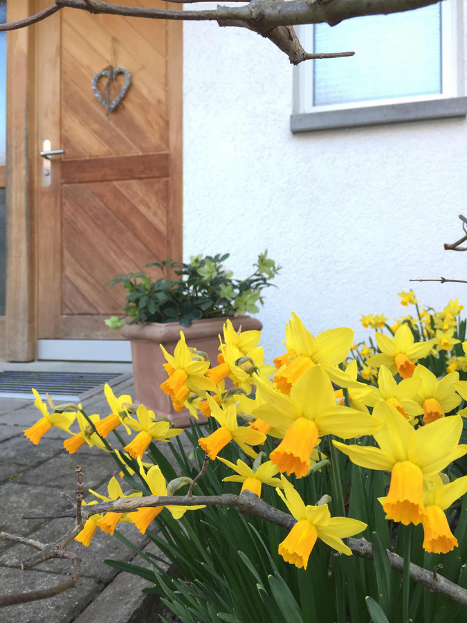 Vorgarten, Hauseingang, Tür, Narzissen, Gelb, Frühling, Blumen, Türkranz, Deko