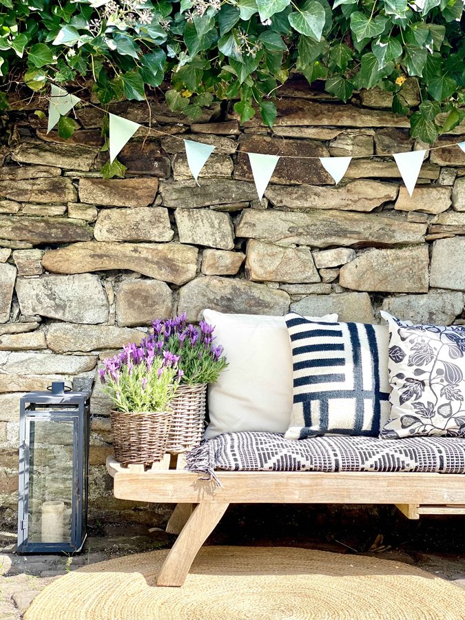 FotoFrage, Sommerwohnzimmer, DIY Wimpelkette, Garten, Bruchsteinmauer