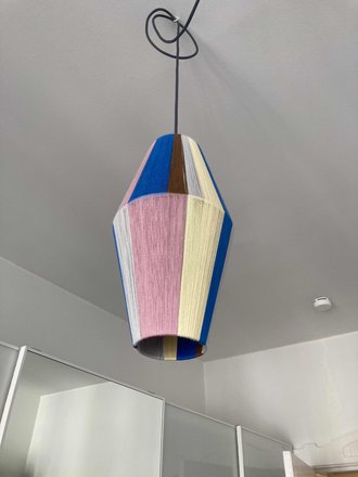 Selbstgemacht. Inspiriert hat mich die Bonbon Lampe von Hay. Da ich mir die nicht leisten kann, habe ich mich selbst ans Werk gemacht. Da ich viel Licht in der Küche wollte, habe ich die Fäden nicht so eng gesponnen. Es war eine schöne meditative Arbeit. Ich habe mich immer mal wieder dran gesetzt. Dauer insgesamt ca. 5 Std.