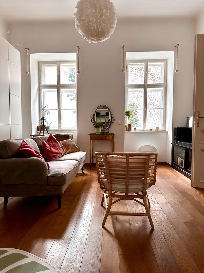 Wohnzimmer, Couch, Sofa, licht, Altbau, Kastenfenster
