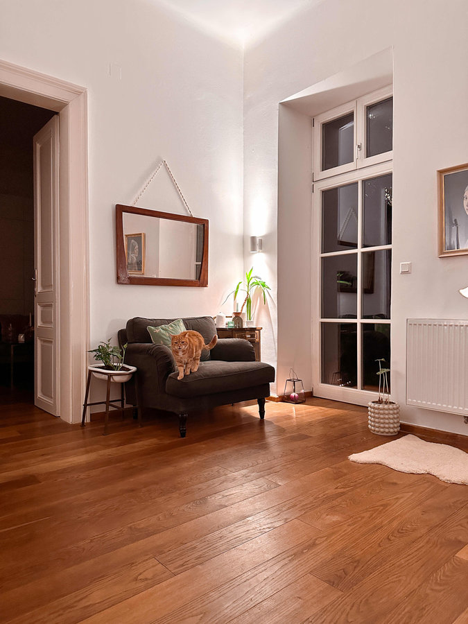 Altbau, Parkett, Sessel, Gemütlich, Flügeltür, Zimmerpflanzen, Katze, Abendstimmung
