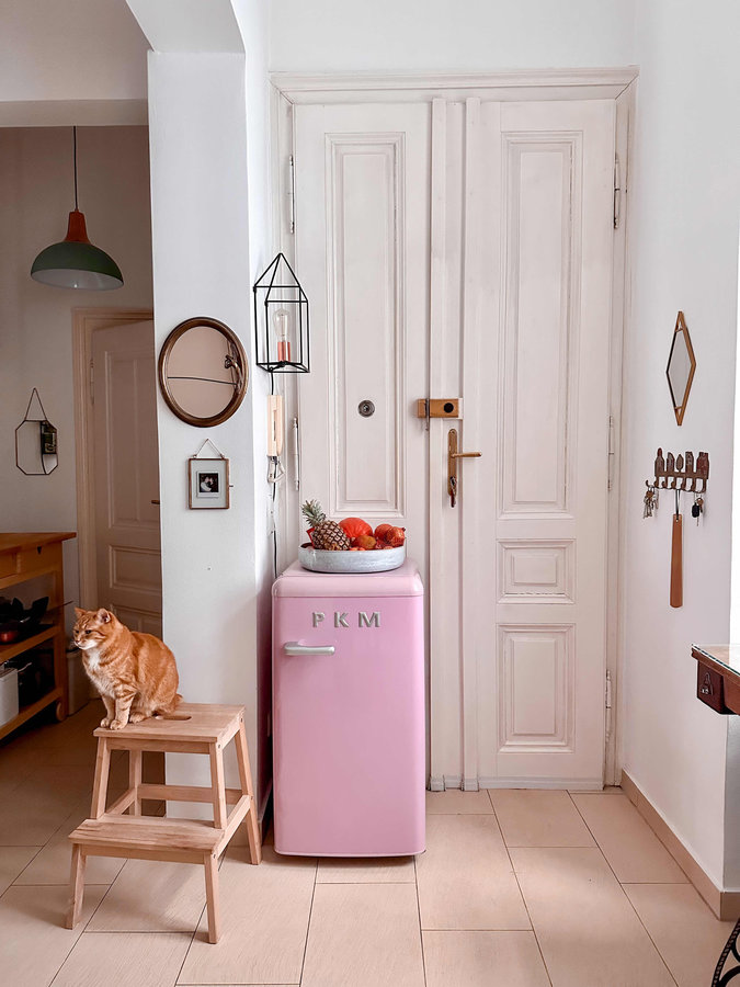 Küche, Kühlschrank, Katze, Eingangsbereich, Tür, Flügeltür, Eingangstür, Wohnungstür, Rosa, Altbau, Vintage, Obst, Obstschale, Flur