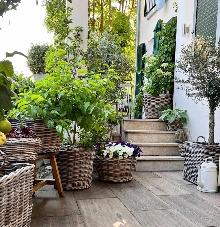 Gartenblick, Garten, Terrasse, Balkon, Rattan, Korb, Pflanzen, Pflanzideen, Sommerdeko, Sommer