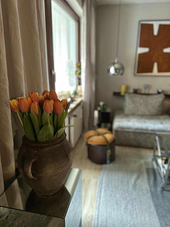 Wohnzimmer, Tulpen, Amphore, Spiegelsäule, Pouf, Kugellampe