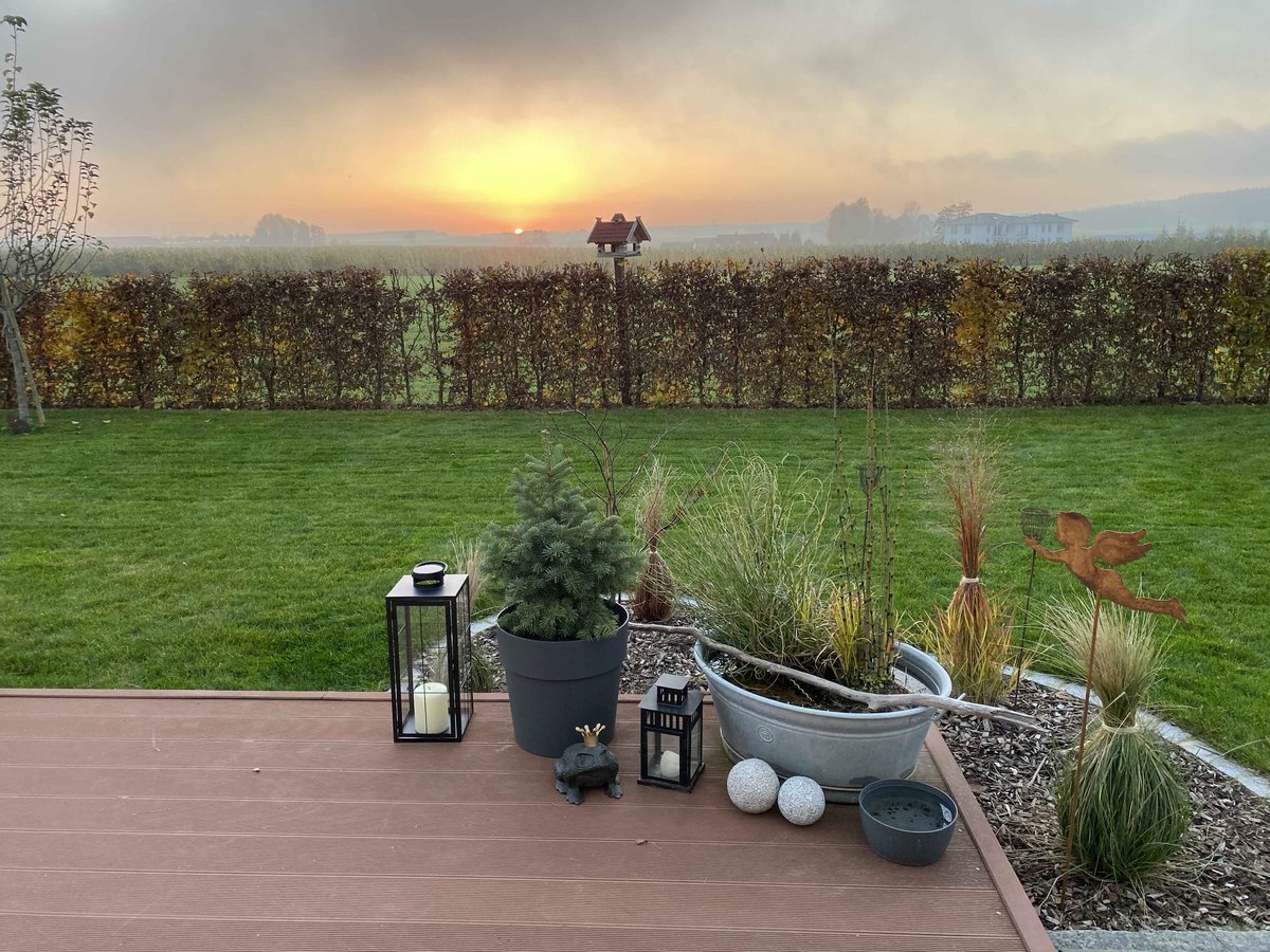 Garten, Herbst, Ausblick, Sonnenuntergang, Nebel