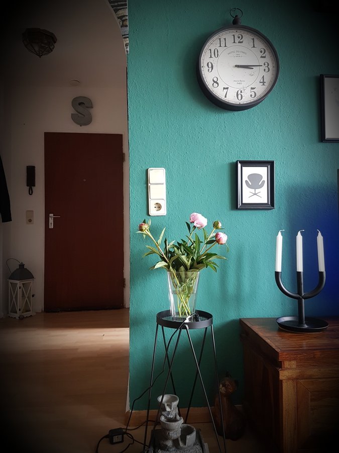 Blumendeko, Pfingstrosen, Grün, Schwarz, Weiß, Rosa, Wohnzimmer, Uhr