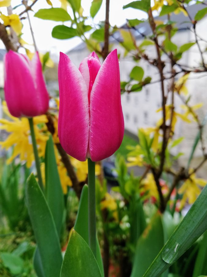 Balkon, Natur, Frühling, Tulpen, Blumen, Forsythien, Regentropfen, Pink, Gelb, Grün