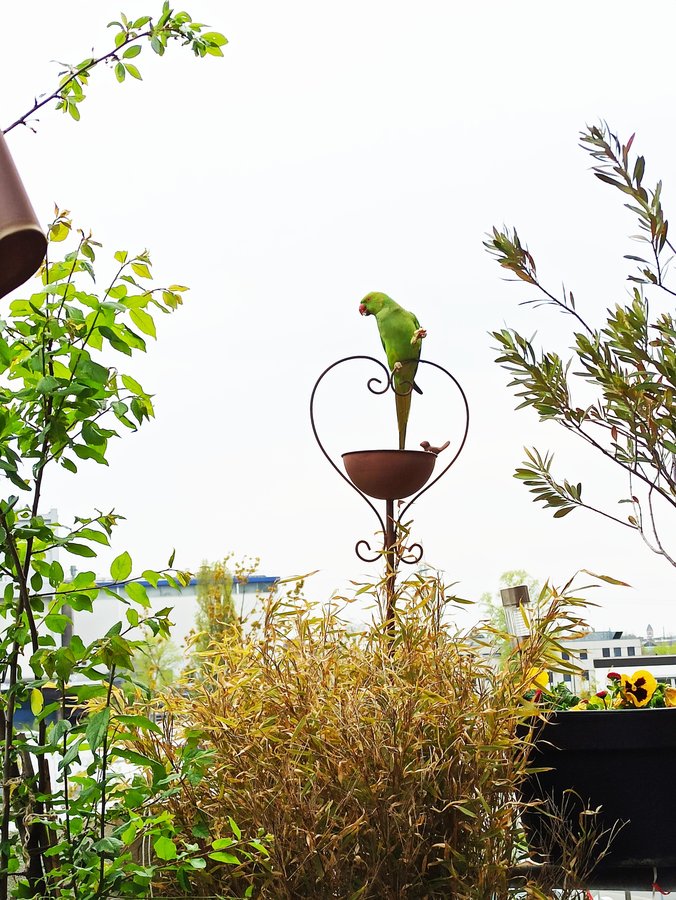 Wohnen, Balkon, Stadtbalkon, Balkonpflanzen, Mein Draussenzimmer, Besuch, Vogeltränke, Halsbandsittich