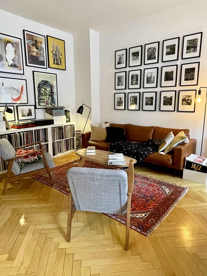 Midcentury, Midcentury modern, Wohnzimmer, Livingroom, Gallerywall, Bildergalerie, Bilderwand, Sofa, Plattenregal, Vinyl, Cozy