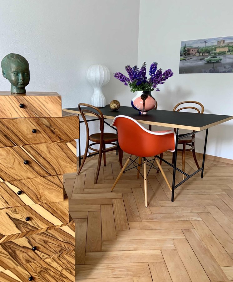 Esstisch, Wohn Esszimmer, Vase, Eames Armchair, Egon Eiermann, Blümchen, Schubladenstapel