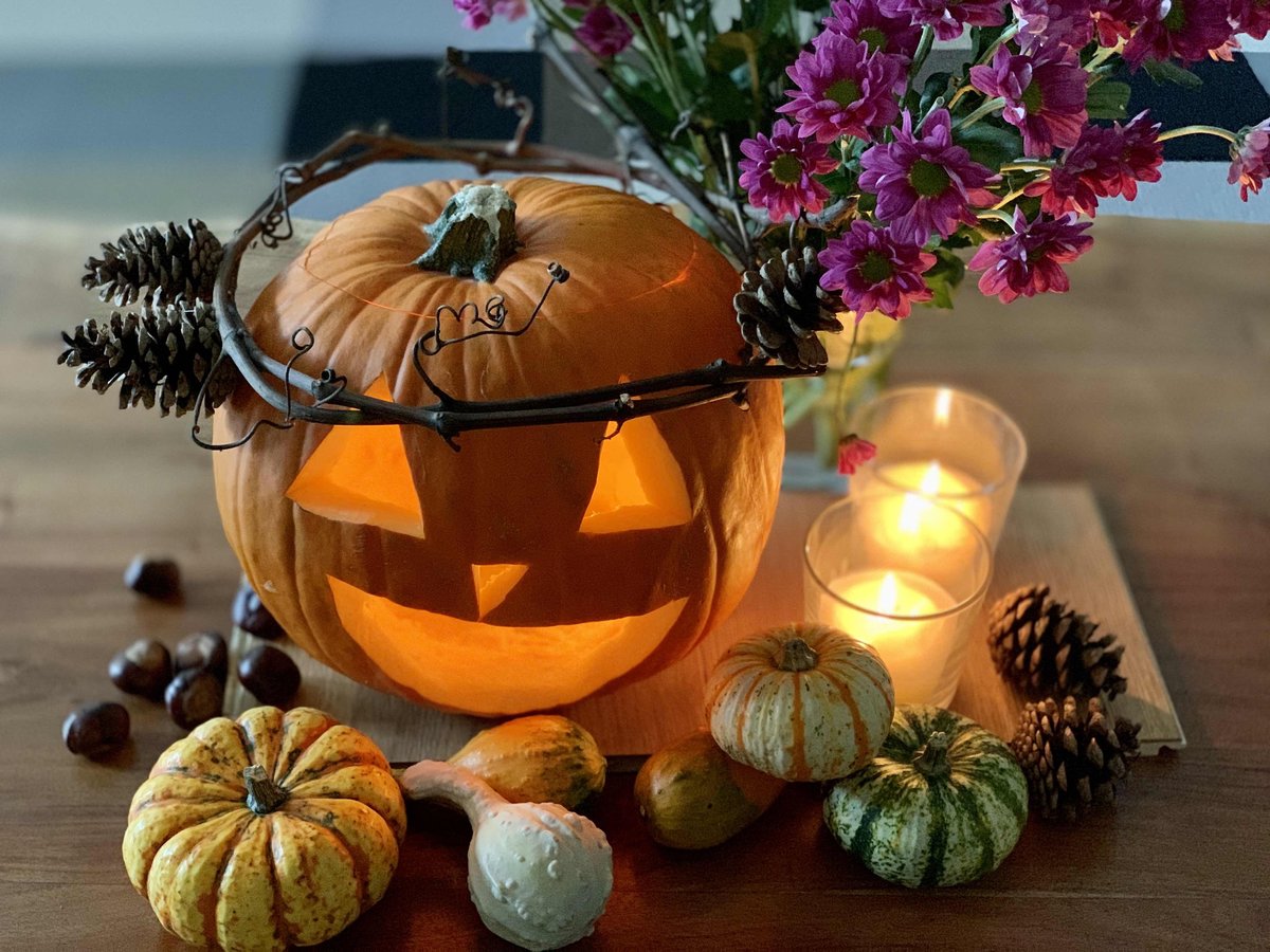 Herbst, Herbstdeko, Herbstfarben, Tischdeko, Kerze, Kerzenlicht, Teelichter, Kürbis, Kastanien, Tannenzapfen, Blumen, Schnittblumen, Holz