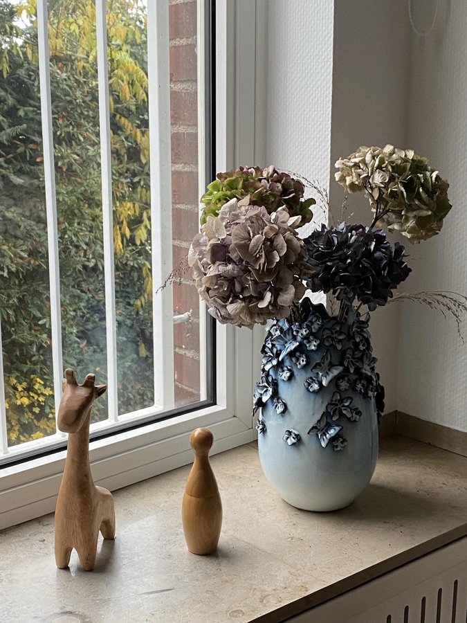 Also bei der Vasensammlung kann ich leider nicht mithalten… aber hier ein Stück. Mit trockenen Gartenhortensien.