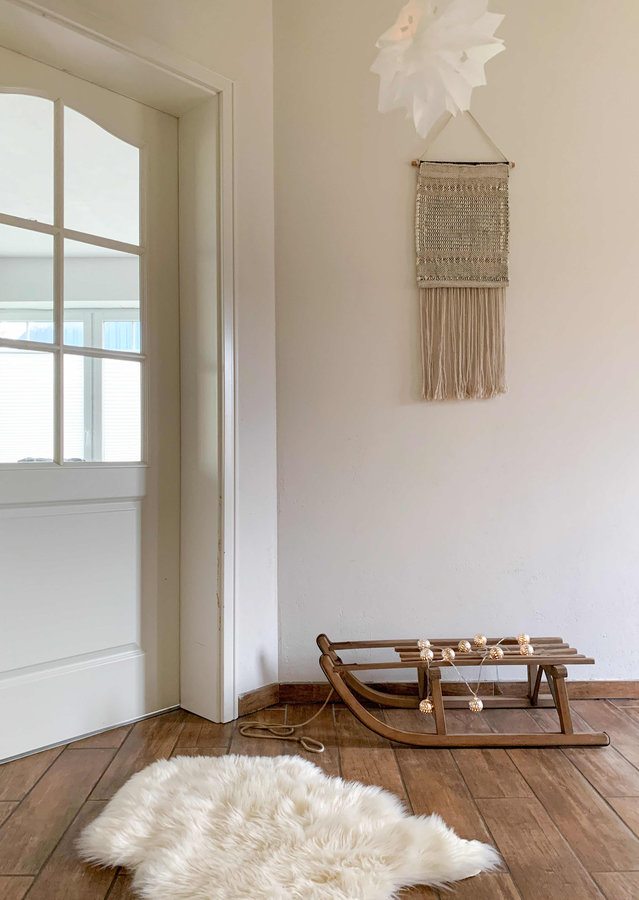 Flur, Schlitten, Winter, Weihnachten, Lichterkette, Vintage, Altholz, Minimalistisch, Nachhaltig, Sterne, Fell