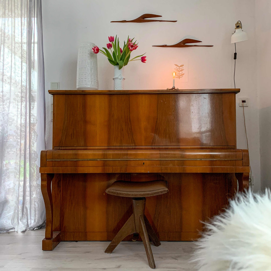 Klavier, Wohnzimmer, Winter, Hygge, Cozy, Wandvogel, Linoldruck, Blumen, Vintage, Vase