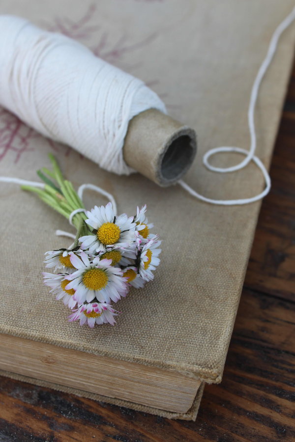 Gänseblümchen, Garnrolle, altes Buch, Romantik, Stillleben