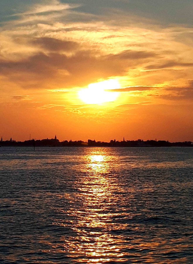 Wir campen gegenüber von Venedig. Der Sonnenuntergang ist heute so besonders schön.....