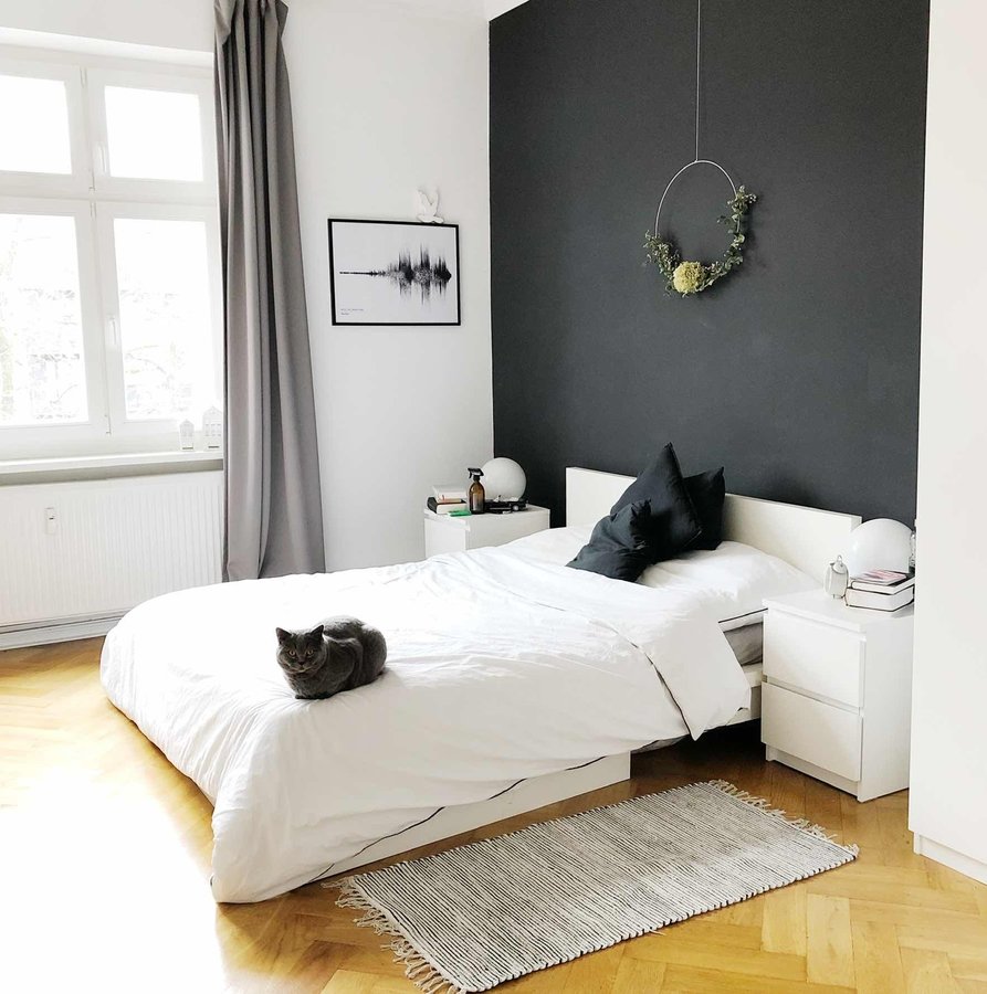 Schlafzimmer, schwarze Wand, Weiß, Altbau, Altbauliebe
