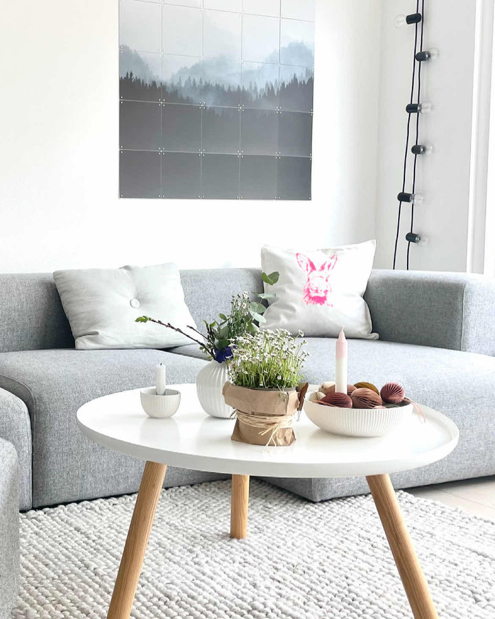 Wohnbereich, Wohnzimmer, Wohnzimmerdeko, Couch, Teppich, HAY, HAY Kissen, Deko im Wohnzimmer, Deko, Dekoideen, Ostern, Osterdeko, Sofa, Sofaecke, Living, Livingroom