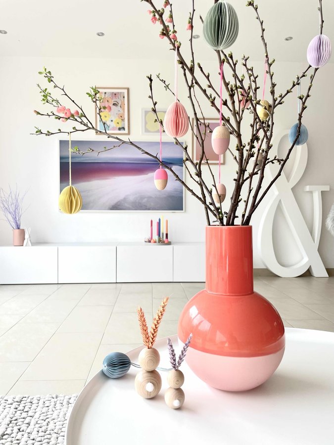 Osterdeko, Osterdekoration, Ostereier, Frühlingsblumen, Frühlingsdeko, Deko, Dekoideen, Wohnzimmer, Fernseher, Bilderwand, Bunt, Farbenfroh, Living, Livingroom, SoLebIch, Osterhase, Basteln, DIY