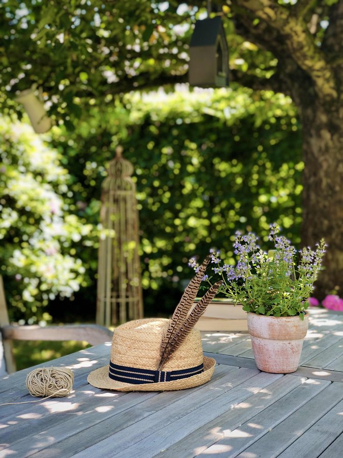 Sonnenhut, Garten, Teak, Strohhut, Apfelbaum, Katzenminze